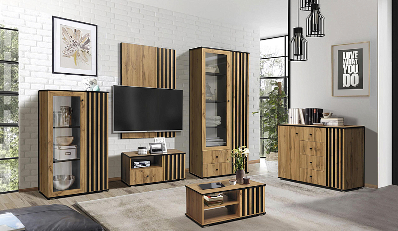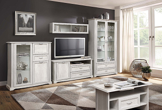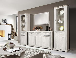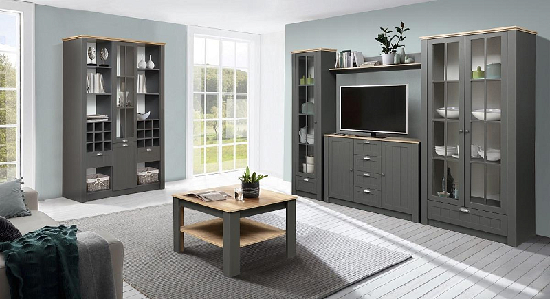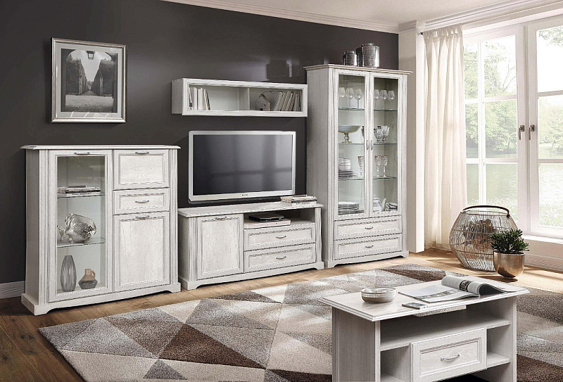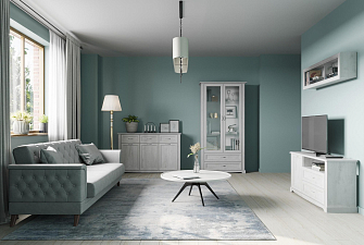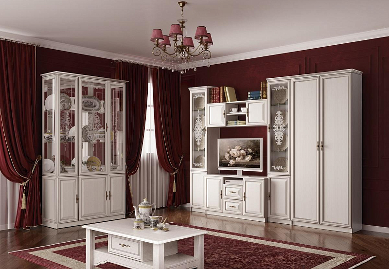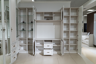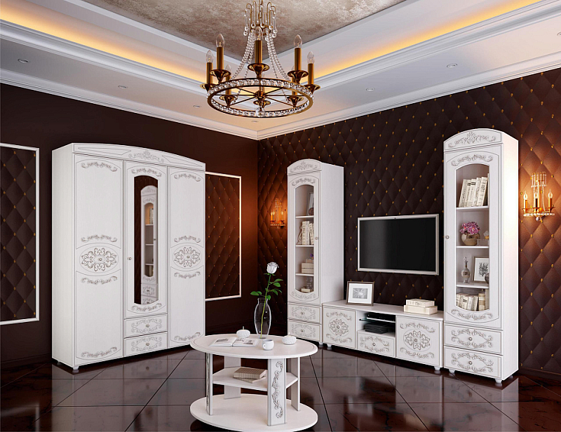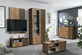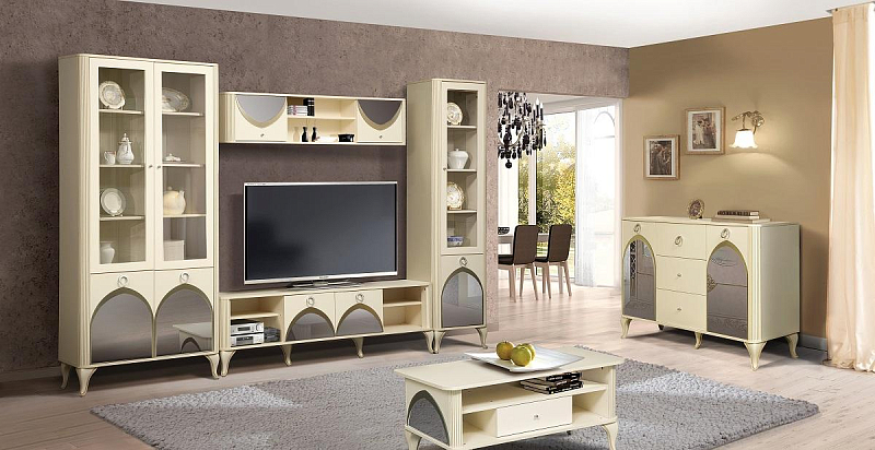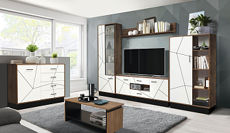 В новых коллекциях тщательно подобраны все составляющие. Легко меняющаяся планировка создает максимум пространства для отдыха, обеспечивает интересные решения зонирования. Открытые полки шкафов перекликаются со стеклянными витринами. Много мест для хранения расположено в отдельных модулях, в качестве которых выступают: