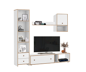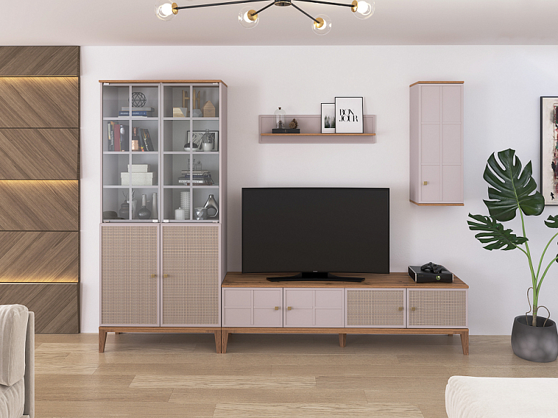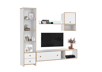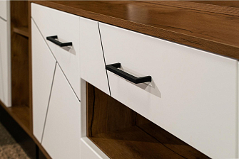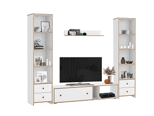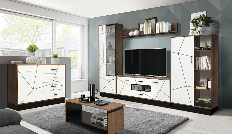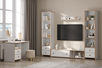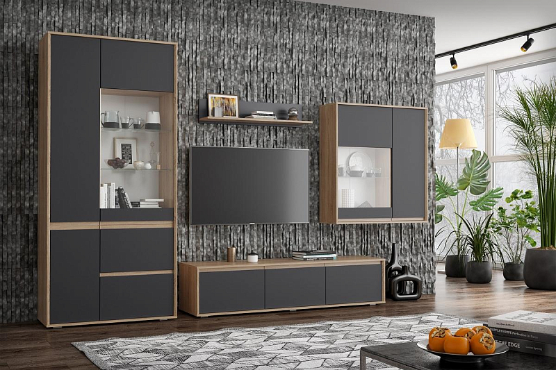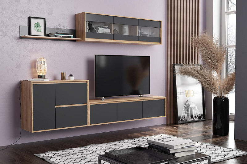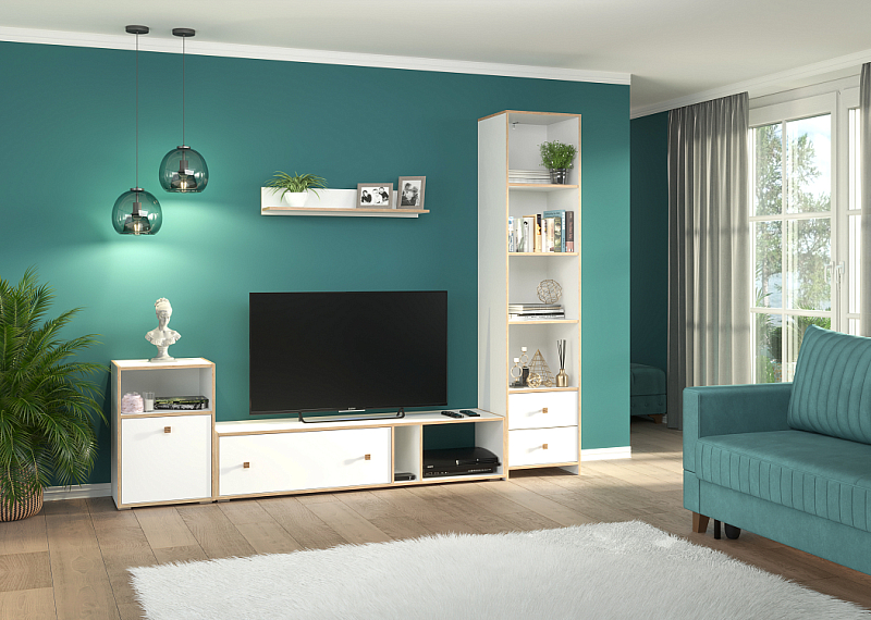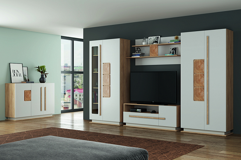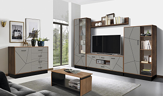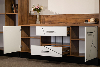 Выдвижные ящики, отсеки внутри модулей, позволяют упорядочить процесс хранения и поиска всевозможных мелочей. Система бесшумного движения обеспечивает плавный ход ящиков и дверей. Разная высота и глубина конструкций позволяет подобрать оптимальные элементы под конкретное пространство гостиной.